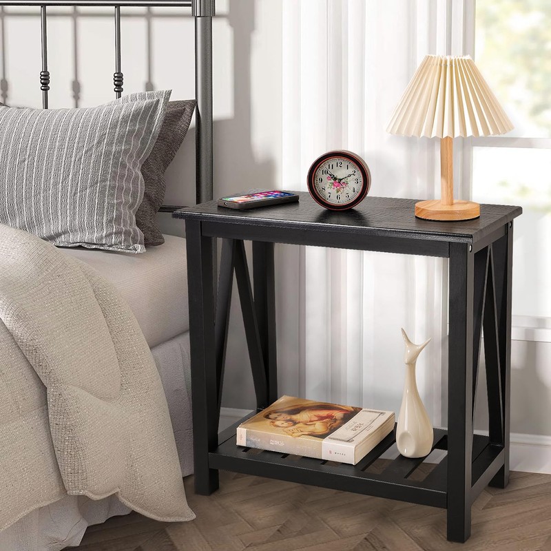 Narrow Side Table with Storage Shelf 2 Tier Wooden Nightstand Bedside Tables for Small Spaces Black Modern Accent Sofa Side Tables for Couch Living Room Bedroom Entryway