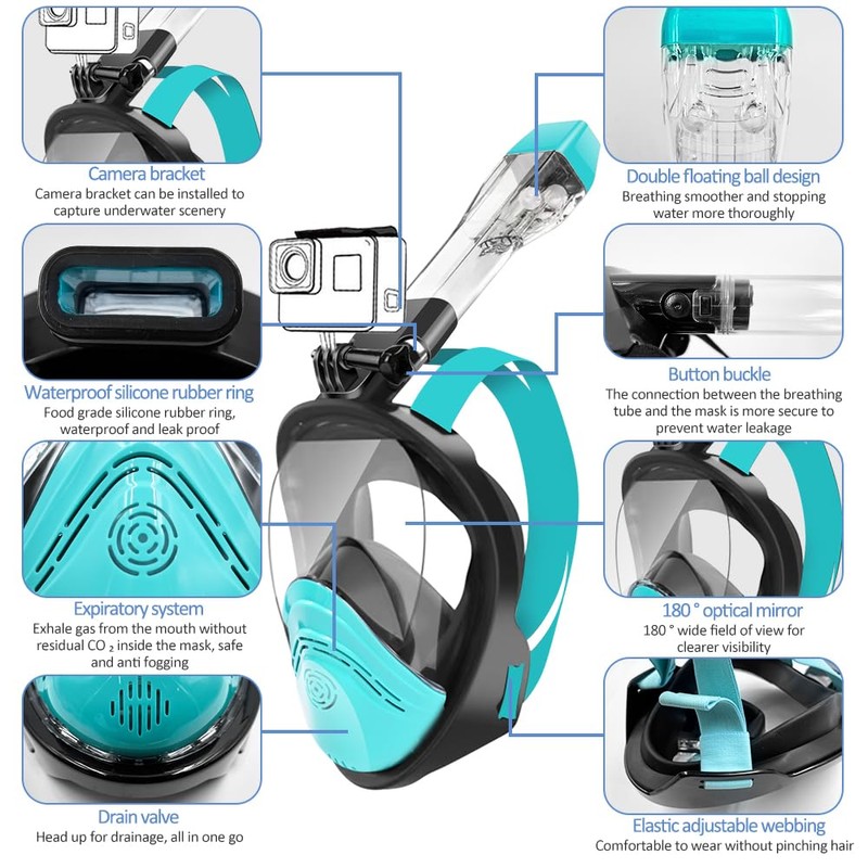 - 🐳【Panoramic View And Support Camera Assembly】 Our snorkel mask can provide a 180°snorkeling experience with no blind spots, allowing a really wide and clear 180°view underwater. So you won't miss the lovely fish and sea creatures that are not directly in front of you. This snorkel mask set is compatible with sports camera mounts, with the removable motion camera mount that allows you to capture every wonderful moment in the sea and share it with your friends.