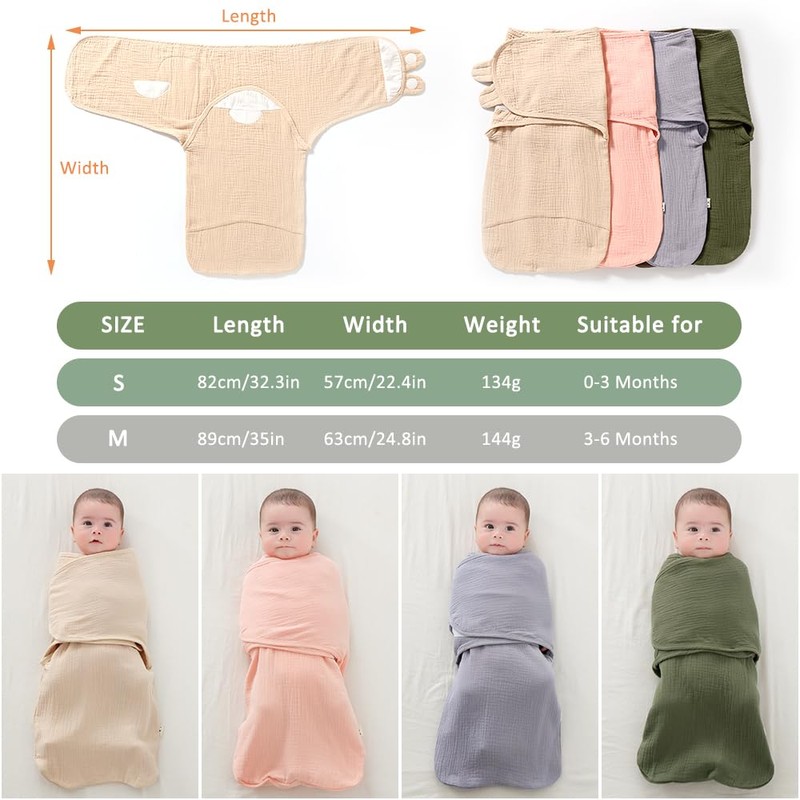 - Wider Quiet Velcro: Baby swaddles has wider velcro, so you can easily adjust & achieve the ideal baby fit. It made of high-density short hook wire interwoven component, it will not hurt baby's skin. And our velcro is noiseless when opening and closing, which is especially friendly to babies who are sensitive to sound.The swaddle has 2 size, the size is S swaddle for suit for 0-3 months baby, the length is 57cm; the size is M swaddle for suit for 3-6 months baby, the length is 63cm.