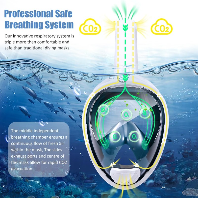 • Professional Anti-Fog and Leak-Proof: The snorkeling mask uses a dual-pane design, to form an insulating air layer between the lenses, reducing direct contact and minimizing temperature differences and reduce fogging, as well as our diving mask is equipped with independent inhalation and exhalation channels to prevent fogging. The snorkel mask full face features an food-grade soft silicone seal with a float ball to prevent water entry. Creating a professional-grade anti-fog and anti-leak design for an amazing snorkeling experience.