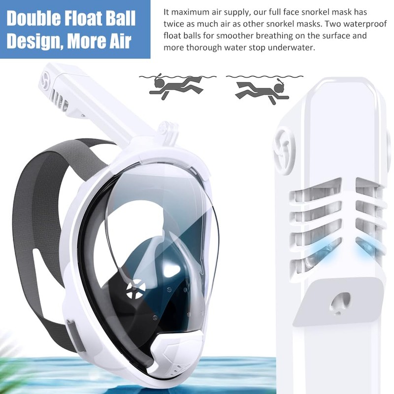 -Our adult full face snorkel mask has a double float ball design that prevents water from entering the mask by using gravity and buoyancy and no leak.