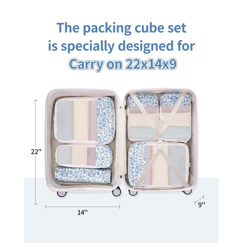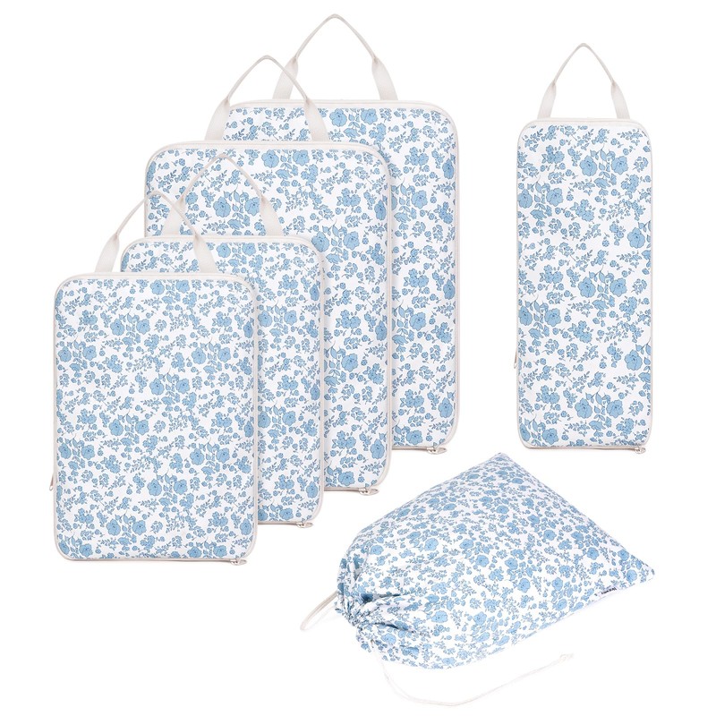 Narwey 6 Set Floral Compression Packing Cubes Travel for Carry on Women, Packing Organizers Bag for Backpack Luggage Suitcase Duffle Bags (Little Blue Flower)