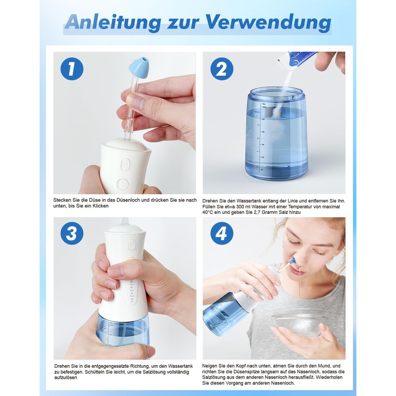 • Easy to Use This nasal salt irrigator is equipped with a refillable 300ml transparent water tank, which allows easy monitoring of water level and ensures a perfect water flow, which is suitable for both adults and children.