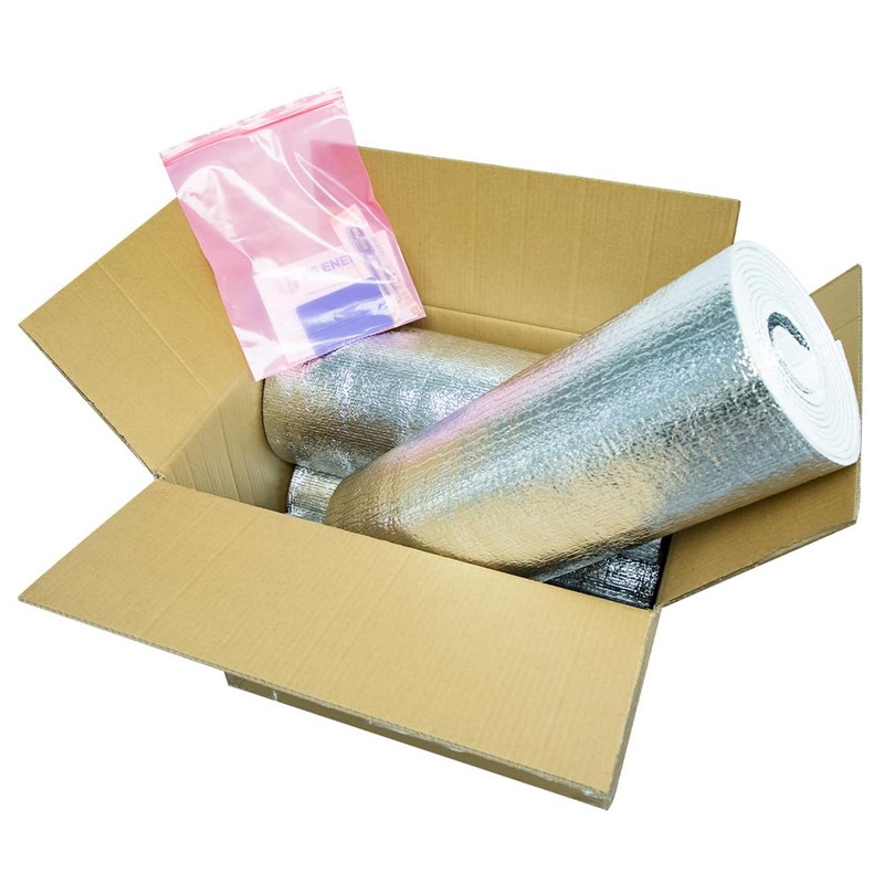 - *This Kit Includes: 5 rolls of 2ft x 18ft White/Foil Foam Core Insulation, Heavy-Duty Double-Sided Tape, Razor, Squeegee, Easy Instructions.
