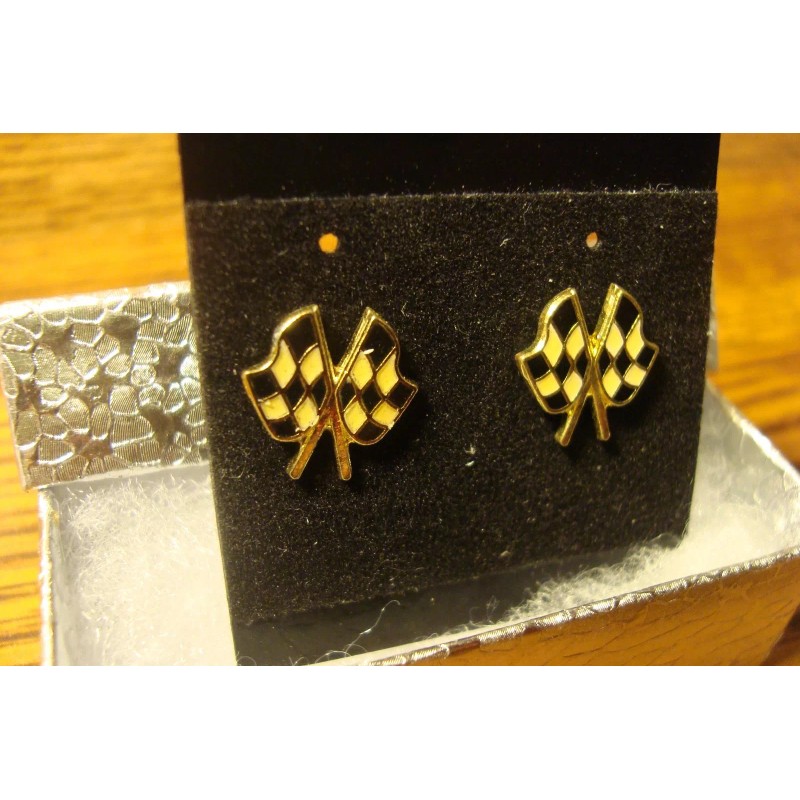 NASCAR: #1 Pair Racing Earrings Enameled Gold Tone Checkered Race Flag Design 2