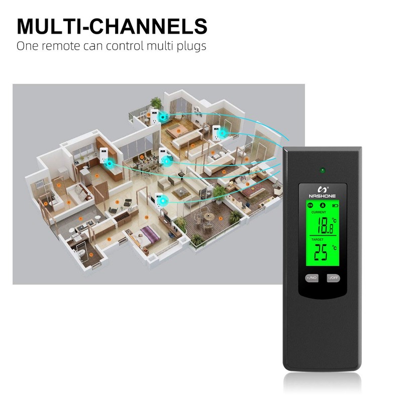 • Wide applications: the intelligent socket thermostat is widely used for room heating, portable heating, wall heating, oil-filled radiators, electric fireplace heater, evaporative cooler, sump cooler, attic fan, window air conditioners, etc.
