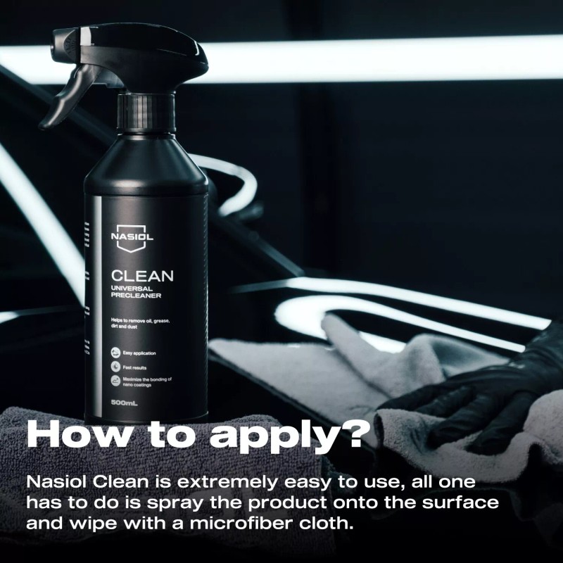 Nasiol Clean is extremely easy to use, all one has to do is spray the product onto the surface and wipe with a microfiber cloth. When you use Clean, only work on cool surfaces and if required, pre-clean the area properly, to get rid of heavy dirt and contamination that may be coating the surface you are wiping down. When you are applying this formula onto a surface that is going to be coated with a nano solution, it increases the bonding performance and effectiveness of the nano product, which is why we often recommend that Clean be used on the surface prior to the application of nano coatings.