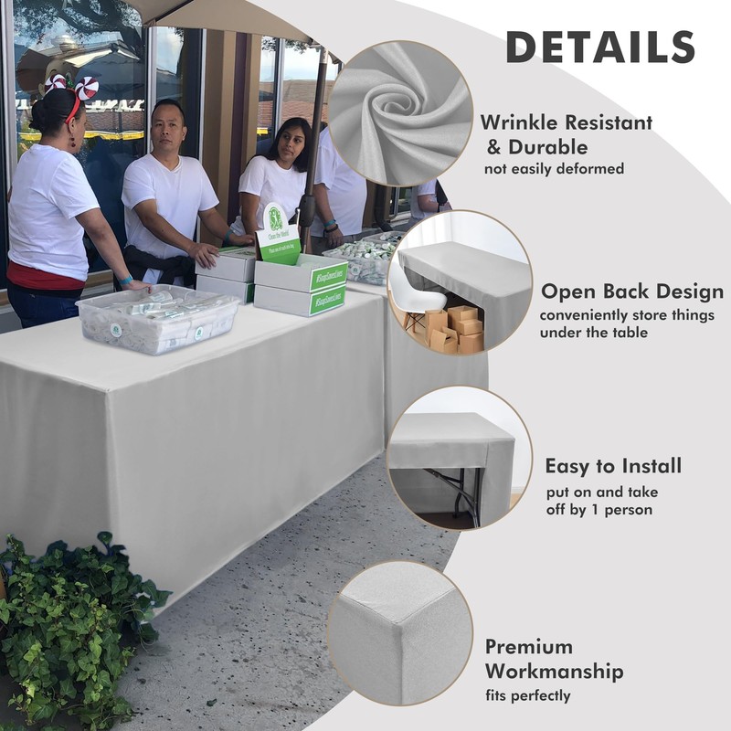 - Open Back Design: Nasitos fitted table cover completely hides the table on the front and sides, provides a professional look for a display table, service table, or other similar types of event purposes. The Our 3-sided tablecloth provides you with a handy place to hide excess giveaways at trade shows and registration areas and compared with normal fitted tablecloths, the open back design tablecloth allows you to sit comfortably behind the table.