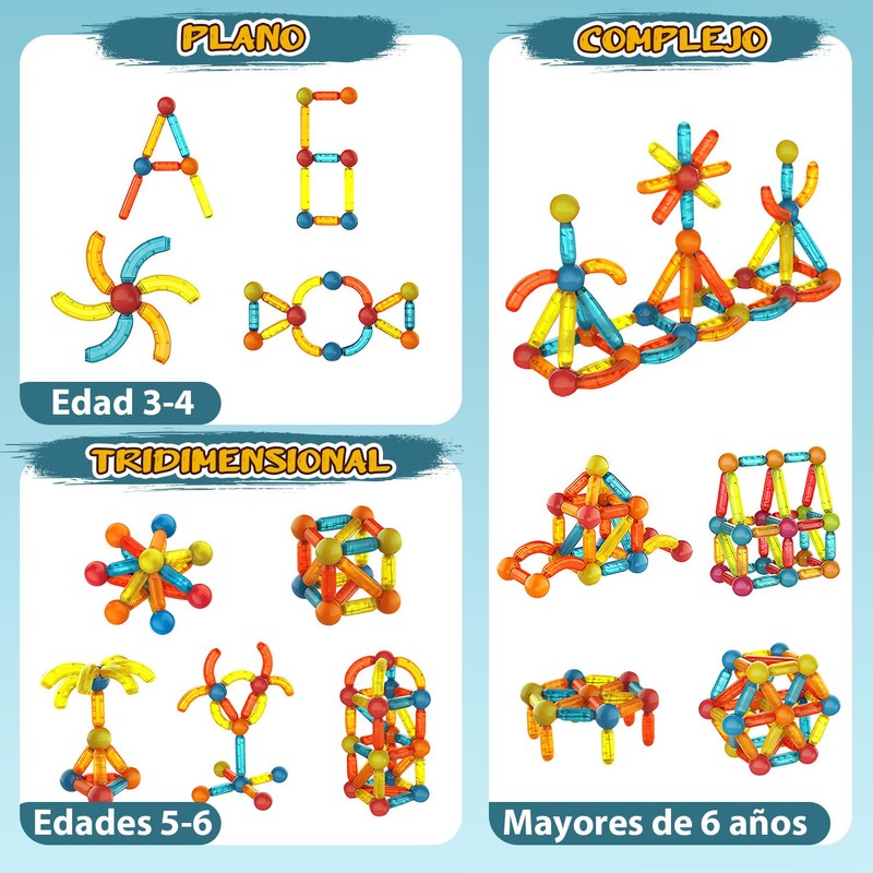 - Diseño de bricolaje para estimular la creatividad de los niños --- La fuerza magnética de las varillas y las bolas es perfecta para conectar y desconectar. Los niños se sentirán atraídos por el proceso táctil de unir las piezas y crear diferentes formas. Este juego fomenta su creatividad y diseño de bricolaje, les permite usar su imaginación para construir objetos, números, animales, edificios y mucho más.