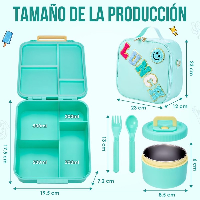 Cada set incluye una fiambrera, una bolsa térmica y un termo aislante para sopa, además de tenedores y cucharas. Todos los accesorios son aptos para lavavajillas, lo que facilita la limpieza a los padres ocupados.