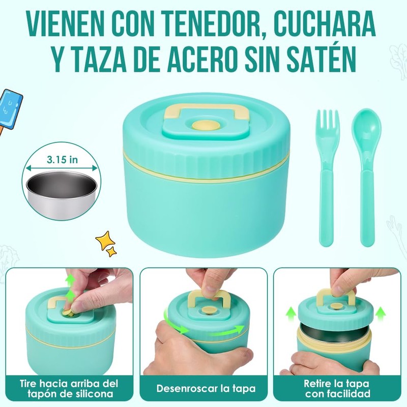 • Cubiertos Incluidos --- El set incluye tenedor y cuchara de PP sin BPA, además de un termo para sopa de acero inoxidable 304 de grado alimentario (300 ml / 10,5 oz). El termo con doble pared mantiene los caldos calientes durante más de 2 horas, ideal para días fríos. Todos los accesorios son aptos para lavavajillas, lo que facilita la limpieza para padres con poco tiempo.