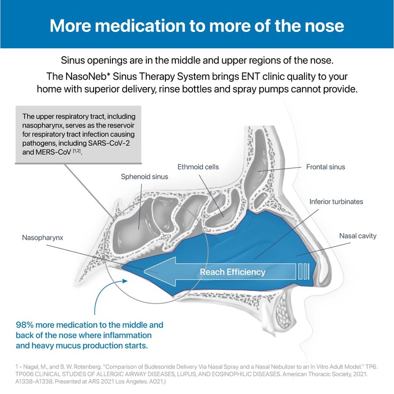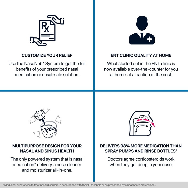 - Scientifically Proven Superior Reach: 98% more delivered to the middle and back of the nose than spray pumps, sinus rinse bottles1, or neti pots. Ear, Nose and Throat (ENT) doctors and Allergists recommend using the NasoNeb* sinus cleaner with saline and prescribed medications for allergies, sinus infection treatment and other nasal disorders and sinus conditions, pre and post surgery care, nighttime and cold congestions, dry nose, and upper airway related breathing difficulties.