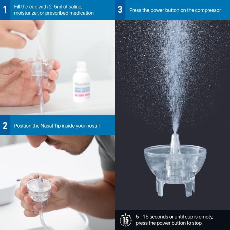 - Easy to Use and Quick to Clean: Treatments usually takes only 30 seconds or less per nostril. Add any nasal safe solutions or prescribed medication treatments to the nasal nebulizer cup, insert tip into your nose and press the on button for consistent coverage with powered airflow every time. No sniffing needed!