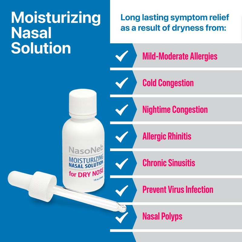 - pH Balance Made for the Nose: NasoNeb nose cleaner machines come with the NasoNeb brand moisturizing nose nasal spray specifically formulated to work with your body's natural moisture creating process for relief from a bloody nose or dry nose, irritation and nasal pain caused by allergies, sinusitis (sinus infection), dry room air, low humidity, CPAP, BiPAP, and cold weather climates. Use moisturizer as directed on the product label.
