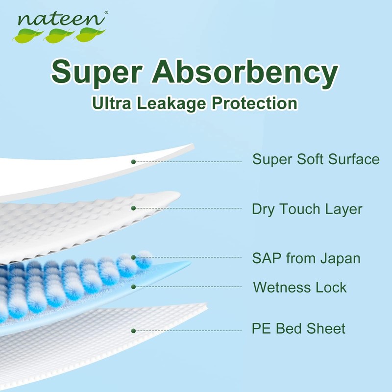 - Super absorbent: Sodium polyacrylate, non-allergenic. Highly absorbent and restrained odors. Acquisition Layer: Third layer to keep the skin dry (100% propylene, very soft touch).