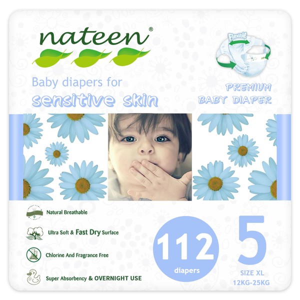 Nateen Premium Baby Diapers, Overnight Use Disposable Diapers for Sensitive Skin, Ultra Thin Diapers with Comfortable Fit. Size 5 (X-Large), 112, Count.