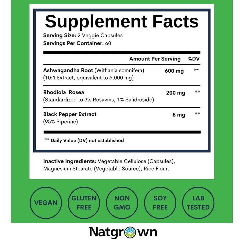Natgrown Rhodiola Rosea with Ashwagandha Root Extract Capsules - Standardized to 3% Rosavins and 1% Salidroside - 120 Count