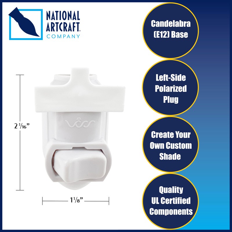National Artcraft's ivory night light is the perfect addition to brighten up those dark spaces. These high-quality UL certified base modules come with a manual rocker-style on/off switch, C7 candelabra base (E12) and ivory plastic clip. Add your own shade for a one-of-a-kind night light.
