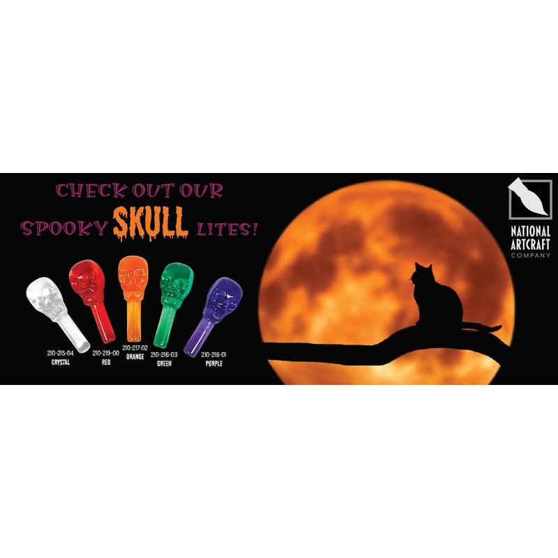 National Artcraft's colorful, plastic skull-shape tree lights are a unique addition to your ceramic tree. "Spruce" up your Halloween tree with these vivid and festive PURPLE lights! The overall height is 1-3/16" and 7/16" wide. The stem is 3/16" in diameter by 9/16" long.
