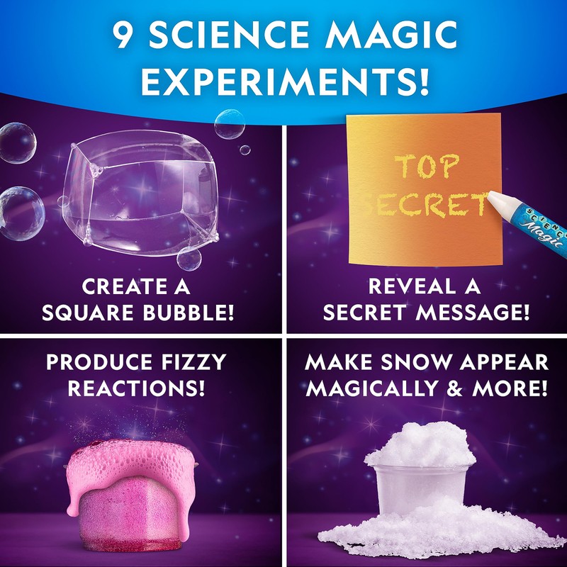 - CONDUCT 9 ASTOUNDING SCIENCE EXPERIMENTS - The magic continues with 9 science experiments that will also amaze and astound audiences! Create a square bubble, reveal a secret message, make magic snow appear, float coins on water, and more!