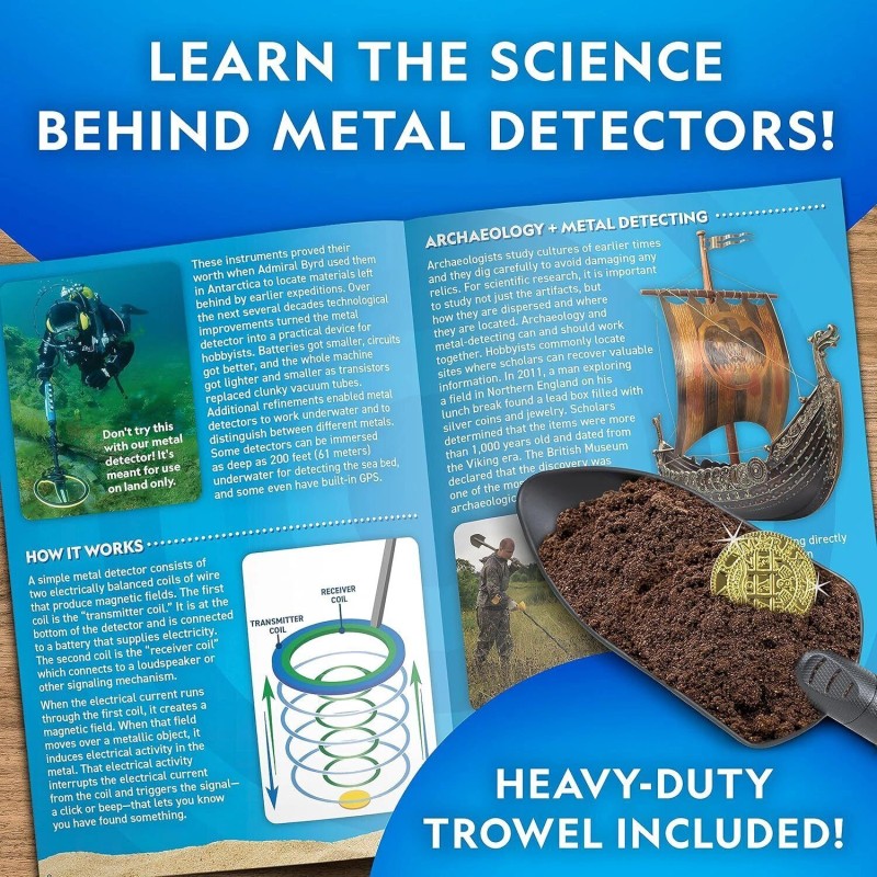 METAL DETECTOR ACCESSORIES INCLUDED - A heavy-duty trowel is included that makes digging up hidden treasure super easy! With the detailed, full-color Learning Guide, kids can learn about the history of metal detecting and more!