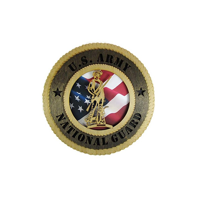 Each plaque is made and assembled in the USA from Baltic Birch. They are finished using golden oak and dark walnut wood stains. The plaque is assembled in layers resulting in an eye-catching 3D effect and the richly colored American Flag background accentuates the highly intricate engraving of the National Guard emblem.