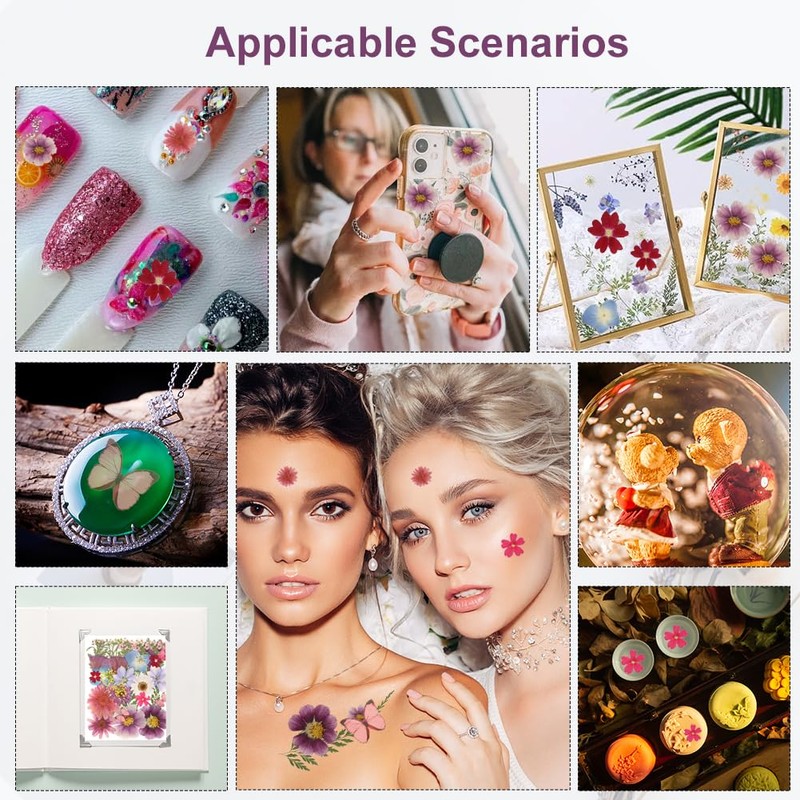 - Different usages: Natural pressed flowers for resin can be widely applied for nail art, resin molds, DIY jewelry design, resin phone case, note card, stationery, wedding invitations, envelopes, stained glass, bookmarks, candle makers, soap making, table decorations, scrapbooking, furniture and wood workings