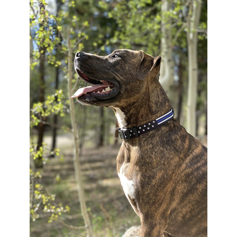 - THIN BLUE LINE FLAG DOG COLLAR: These durable Thin Blue Line Flag dog collars are made of durable polyester that’s impossible to tear. Strong plastic clips reliably secure the collar around any dog’s neck. Metal D-Rings provide a secure attachment point for your leash.