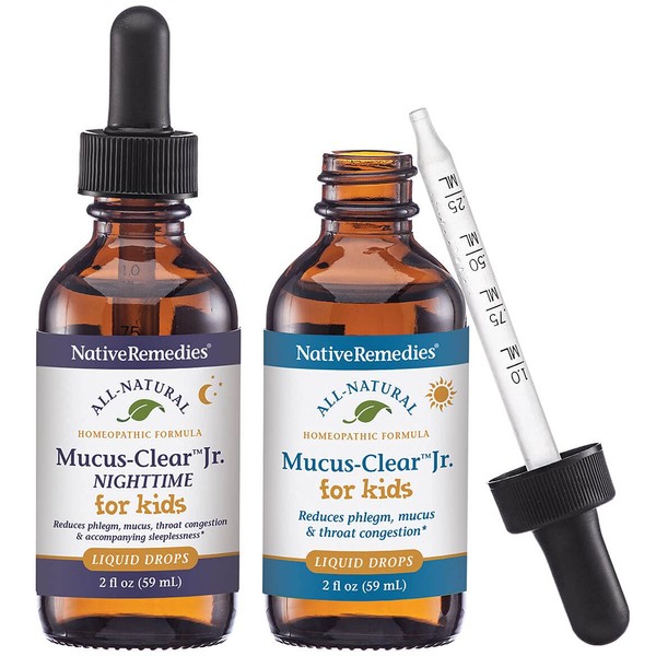 "With the Mucus-Clear Jr. ComboPack, you receive a two-part approach to relieve excess mucus congestion and common cold symptoms in babies and children. Encourage clear and unobstructed breathing with this natural homeopathic duo. Specially formulated to work together, Mucus-Clear Jr. and Mucus-Clear Jr. Nighttime provide 24 hour relief from blocked noses, mucus congestion, throat congestion, and hoarseness. Mucus-Clear Nighttime contains ingredients specifically chosen to relieve mucus at night and allow your child a peaceful night's sleep.Respiratory infections are common, especially in children in school and day care - with infections going round and round among classmates. While these passing infections can actually help strengthen and build the immune system, managing the symptoms naturally helps prevent secondary infection and eases discomfort while promoting recovery. The complete Mucus-Clear Jr. ComboPack provides all-natural around the clock relief of the common symptoms of excessive mucus or throat congestion without the use of daytime stimulants or nighttime sedatives that may cause daytime drowsiness.These powerful homeopathic formulas address the discomfort associated with common cold symptoms and congestion. Using unique proprietary blends of natural substances, Mucus-Clear Jr. and Mucus-Clear Jr. Nighttime provide the effective and safe choice for temporary relief of common symptoms of congestion, excessive coughing, throat clearing and other signs of irritation. Mucus-Clear Jr. and Mucus-Clear Jr. Nighttime are safe, effective, non-addictive natural remedies made of 100% homeopathic ingredients. Since homeopathic remedies have no known side effects or interactions with prescription medicine or herbal supplements, they are safe to use for all ages."