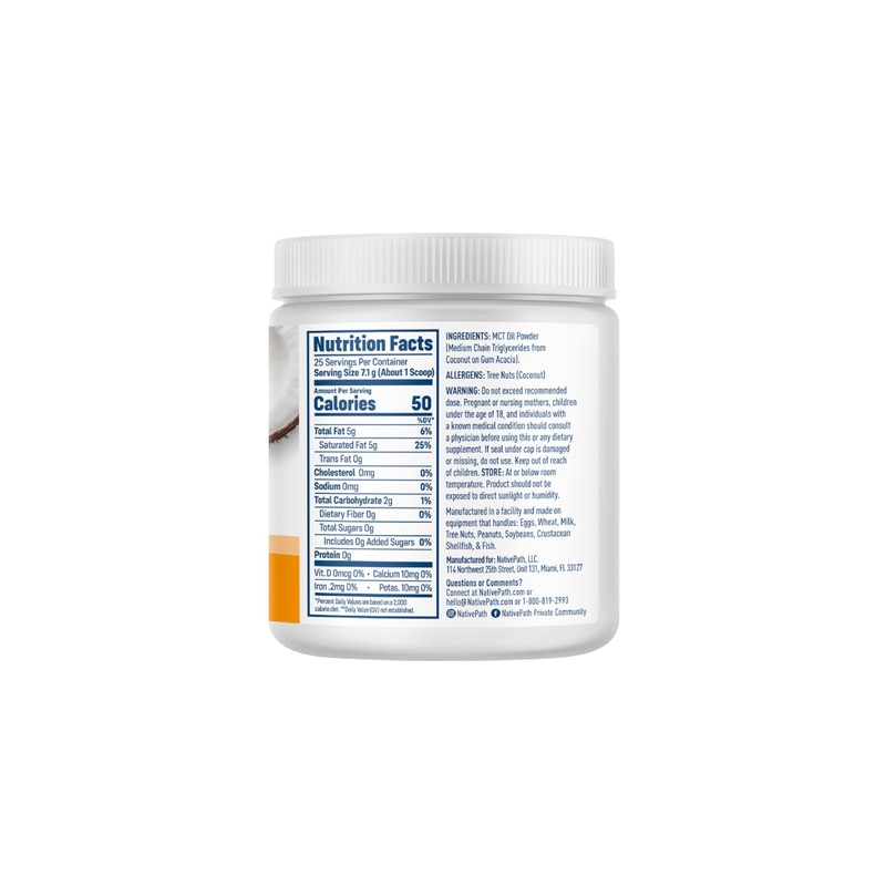 - MADE FROM REAL COCONUT: Sourced from raw coconut, each scoop of NativePath MCT Powder features 5 grams of MCTs and a 60/40 split of C8 and C10. Each jar is produced in a certified GMP facility and is third-party tested for purity and potency.