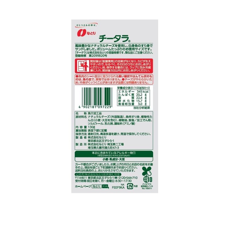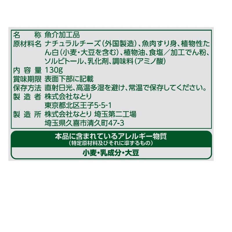 • Ingredients: Natural cheese (made in Japan, manufactured overseas), fish meat, vegetable protein (including wheat and soy), vegetable oil, salt/processed starch, sorbitol, emulsifier, seasoning (amino acid)