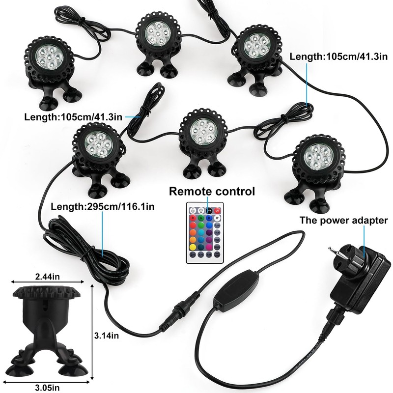 • RGB pond light with remote control: Our underwater headlight offers 16 colours, 4 modes of dynamic effects, and brightness adjustable, you can freely control the lamp via the wireless remote control.