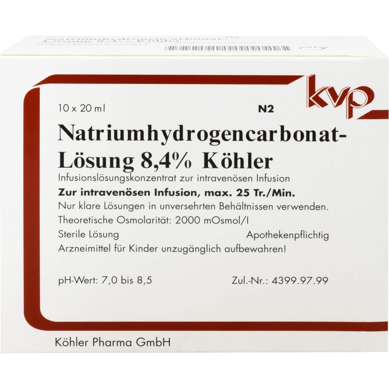 Natriumhydrogencarbonat-Lösung 8,4 % Köhler, Infusionslösung. Anwendungsgebiete: Metabolische Azidosen Alkalisierung bei Barbiturat- und Salicylatvergiftungen.