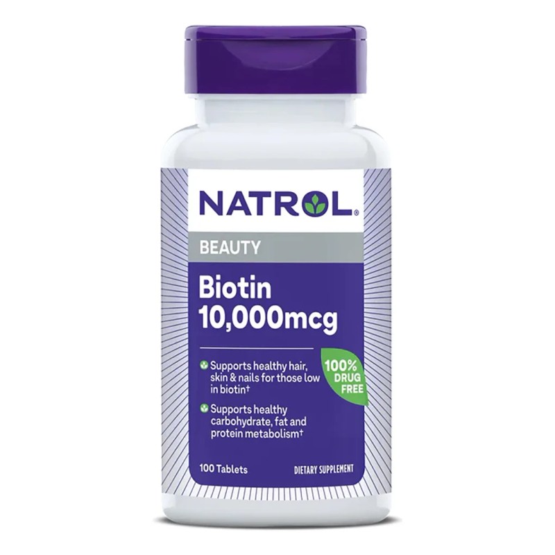 Natrol Biotin promueve el crecimiento de un cabello saludable y el fortalecimiento de las uñas.