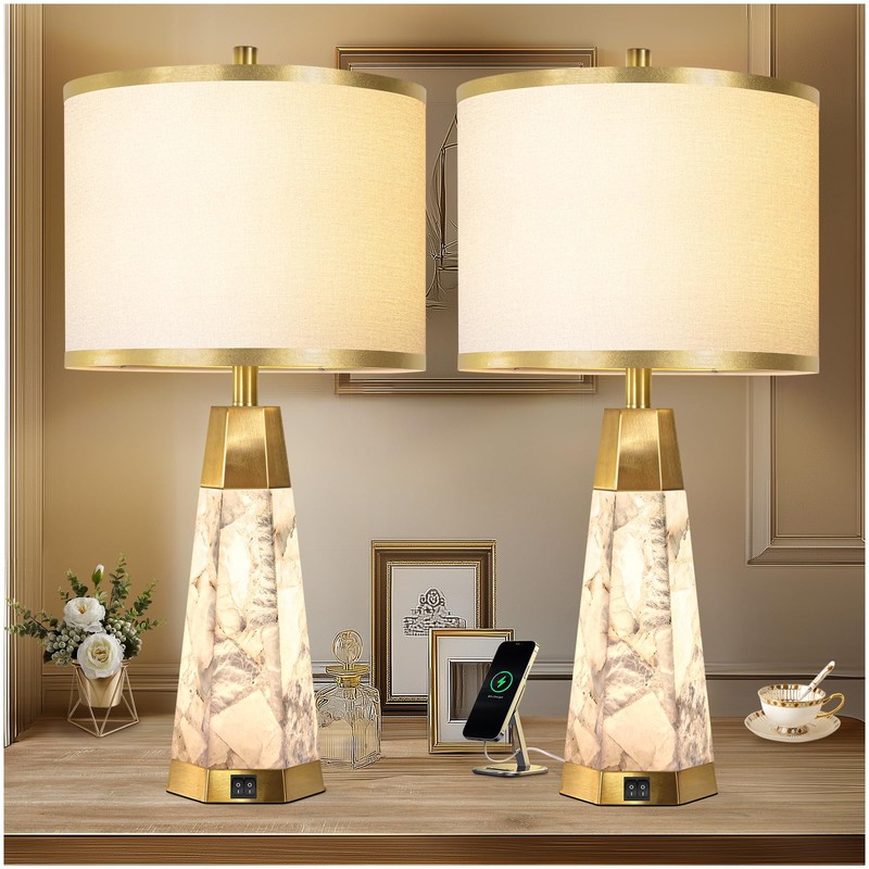 Natural Alabaster Table Lamps Set of 2 - Lamps for Living Room with Night Light, Bedside lamps with White Linen Lamp Shade with Gold Trim,Nightstand lamp with USB A+C Ports for Bedroom Office Hotel