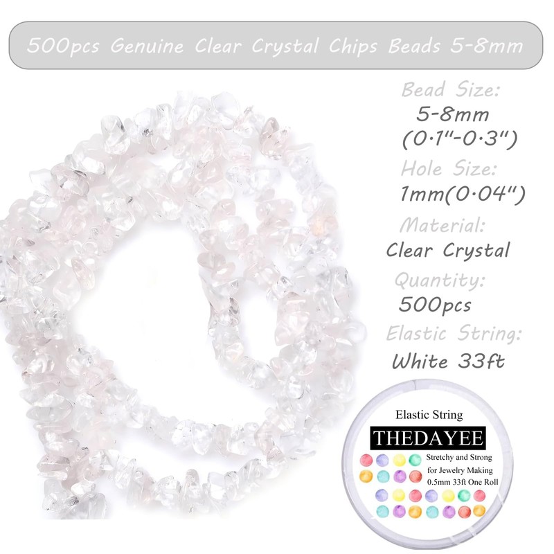 - [SIZE & QUANTITIES] - Bead diameter: 5-8mm(0.1"-0.3"); Hole diameter: 1mm(0.039"). Total 450 pieces/pack. The package comes with 450pcs 5-8mm genuine gemstone chip beads, and 33ft length elastic string cord and beading needle, which helps you to DIY all kinds of creative jewelry.