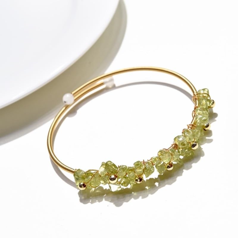Natural Crystal Flower Cuff Healing Bracelet Bangle | Amethyst Aquamarine Peridot Tourmaline Strawberry Quartz Crystal Chip Bracelet (Peridot)