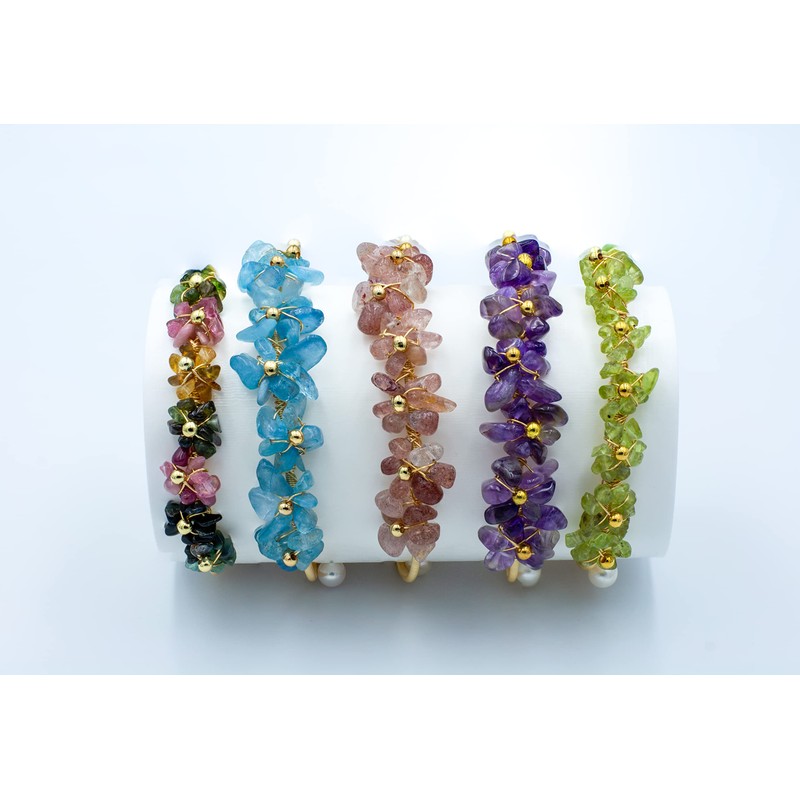 - Material and Stone: the crystal flowers are wrapped in 14K gold plated wires. All crystals are natural with healing properties and are good for meditation purpose. The various crystals available include: aquamarine, peridot, strawberry quartz, tourmaline, amethyst;