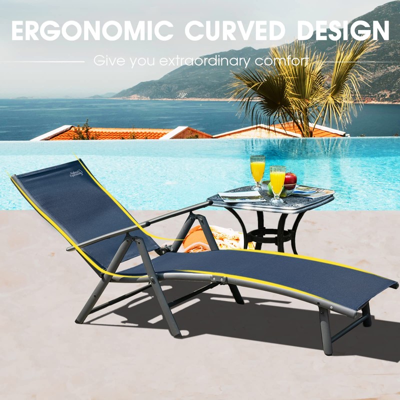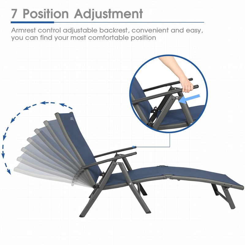 - 【7 RECLINING POSITIONS & LOCKING SYSTEM】The curved back of the lounge chair fits perfectly into your back,offers reduce your muscle tension and stress,perfect balance between firmness and softness; The backrest with 7 adjustable reclining positions could meet your different leisure needs, you can read a book, sleep or lying; This patio lounge chair features a locking system which provides safety support.The bar behind the backrest can be rotated,you can adjust its position avoid rub.