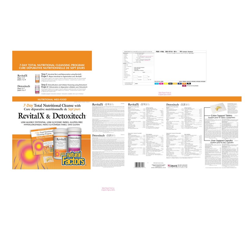 Natural Factors' unique 7-Day Total Nutritional Cleanse with RevitalX & Detoxitech contains low-allergy, gluten-free, and low-glycemic index ingredients to provide gastrointestinal nutritional support for detoxification. Each step prepares the digestive and gastrointestinal systems for detoxification while providing nourishment for the body. Step 1: Intestinal Rest and Rejuvenation using RevitalX Colon Support Tablets & Liver Support Capsules: additional supplements taken each day (enclosed) Step 2: Detoxification and Cellular Cleansing using Detoxitech Colon Support Tablets & Liver Support Capsules: additional supplements taken each day (enclosed)