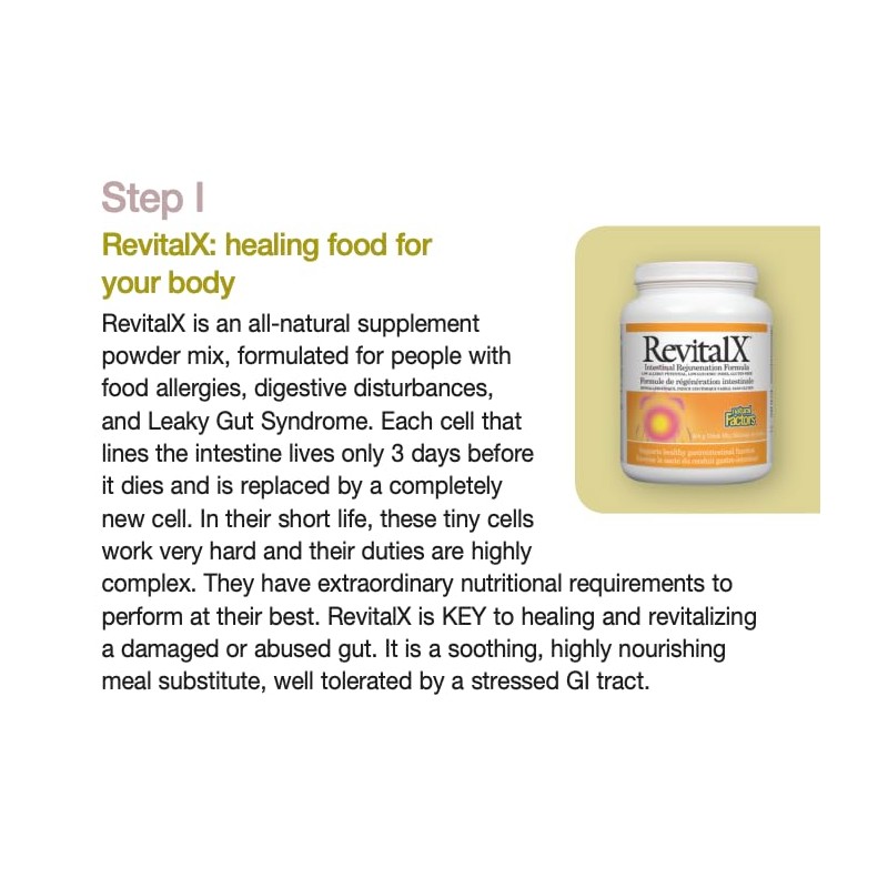 - STEP 1: RevitalX is an intestinal rejuvenation formula. It is a comprehensive blend of nutrients, probiotics, and enzymes that rejuvenates the digestive tract while repairing intestinal cells.