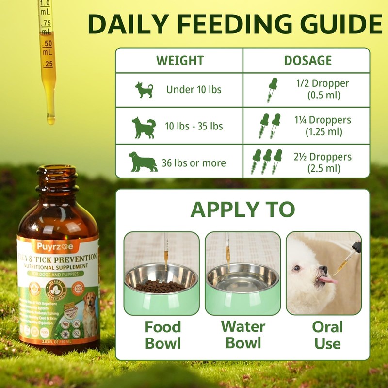- All Size and Breeds – Puyrzoe flea treatment dogs support drops provide precise dosing based on your dog’s weight, ensuring optimal results for every pet. Whether your dog weighs under 10 lbs(1/2 Dropper - 0.5 ml), 10-35 lbs(1¼ Droppers - 1.25 ml), or over 36 lbs(2½ Droppers - 2.5 ml), you can easily adjust the dosage according to their weight.