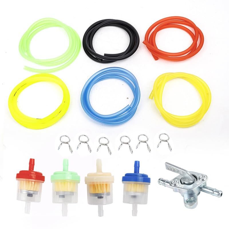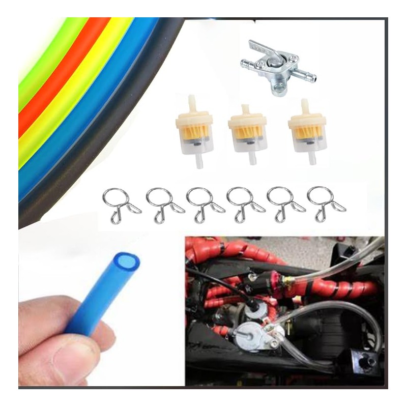 - Package includes: 1 fuel line hose, 3 fuel filters, 6 spring clamps, 1 inline shutoff valve plug.