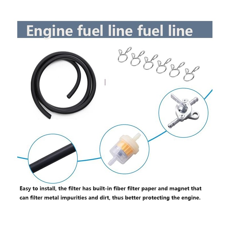 - EASY TO INSTALL - The fuel line hose is made of high quality rubber material, high toughness and not easy to deform, the spring clamp is adjustable and easier to install. The fuel plug is made of zinc alloy, you can control the fuel flow by the markings on the fuel plug.