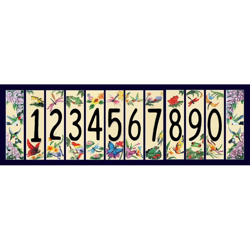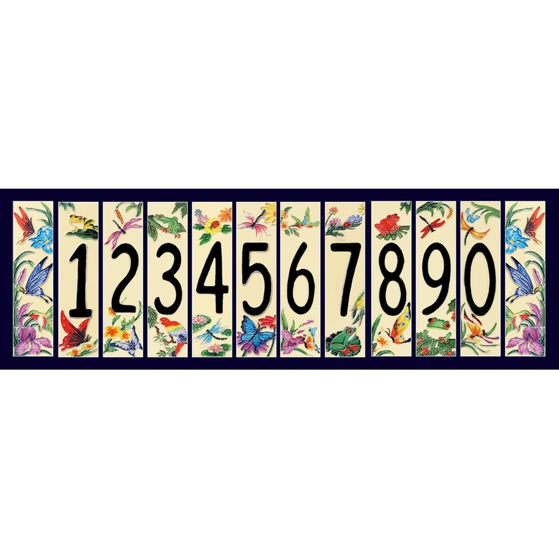 These 2” x 8.5” ceramic art hand-painted House Numbers will add a lovely touch to the entrance of your house. Each House Number can easily attached to a wall or fence. As shown in the image above, the top and bottom designs on each tile can be combined with two matching end tiles to create the appearance of a closed frame around the house numbers. No hassle on installation! Our House Number tiles are molded with a small hole so they can be installed without a frame. Outdoor safe.