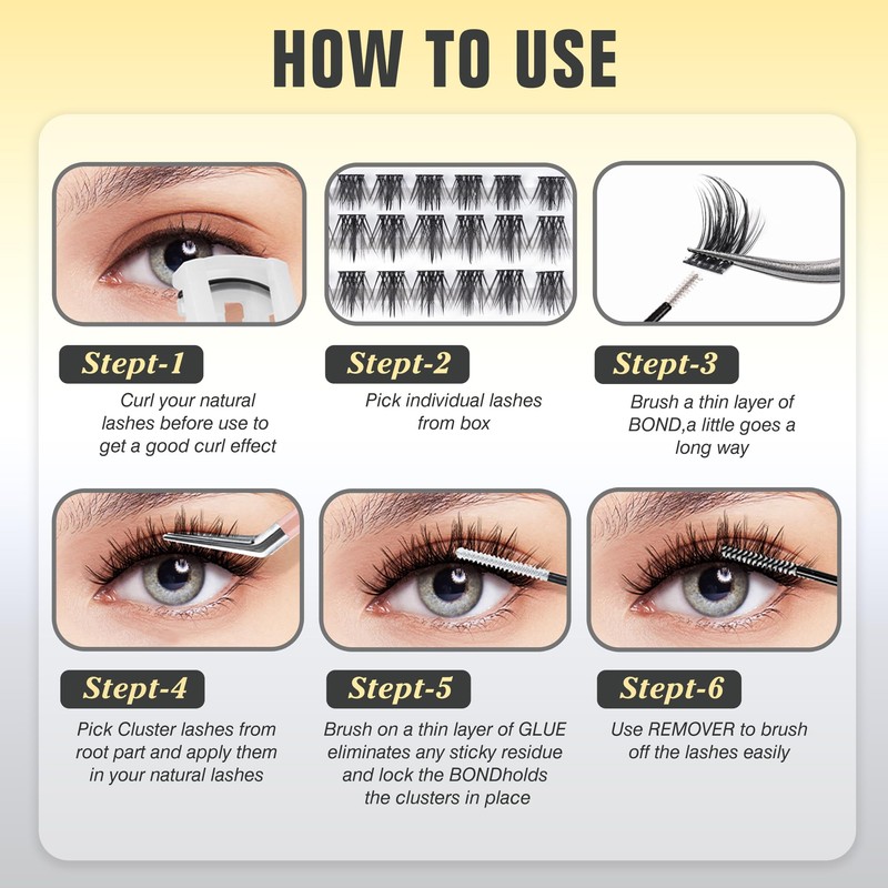 - 【Easy Application Instructions】 ① Trim Clusters Lashes to fit eye shape ② Apply adhesive and wait 10 seconds ③ Press along natural lash line ④ Adjust for perfect placement Note: This is a single product.