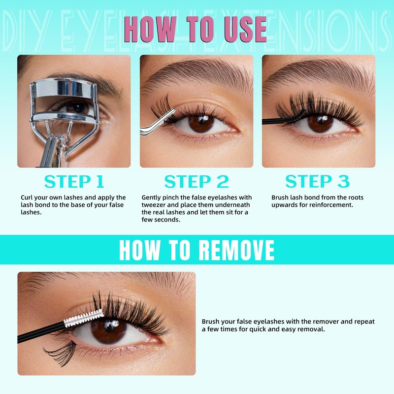 - Usage Suggestions: Please use tweezers to gently pick up the individual lashes from the band. Try attaching false cluster lashes underneath your own lashes for better fusion.