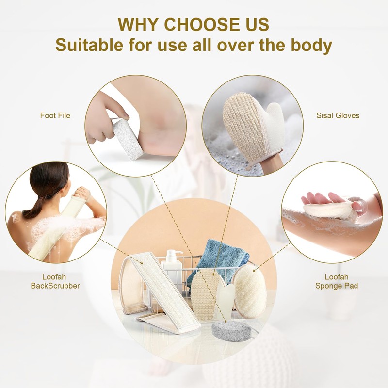 - Easy 3-Step Routine: Step 1: Soak in warm water to soften. Step 2: Apply soap and scrub in circular motions (use the glove/pad for tough areas, washcloth for full-body, pumice for feet). Step 3: Rinse and air-dry - revealing radiant, baby-soft skin.