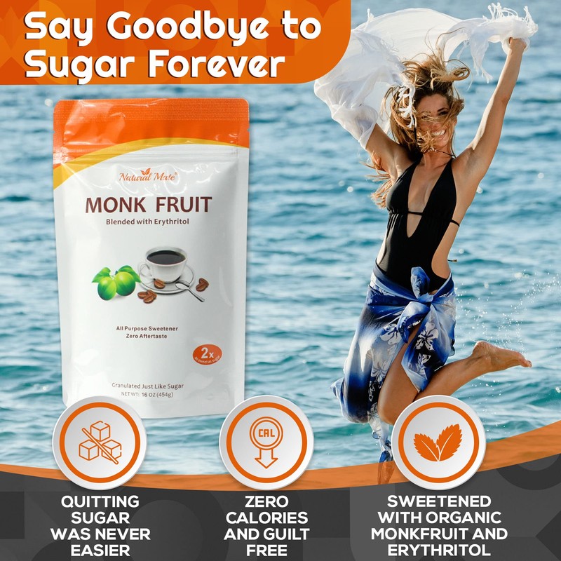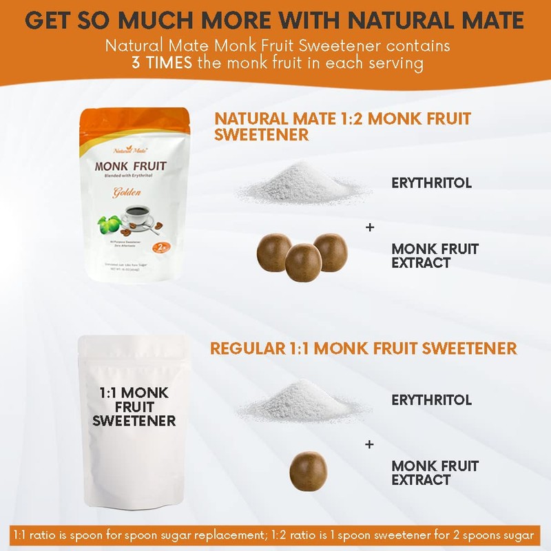 Natural Mate All Purpose Monk Fruit Sweetener is blended from the real fruit extract and Erythritol, which brings you a rich and sweet sugar taste without the calories and bitter aftertaste.