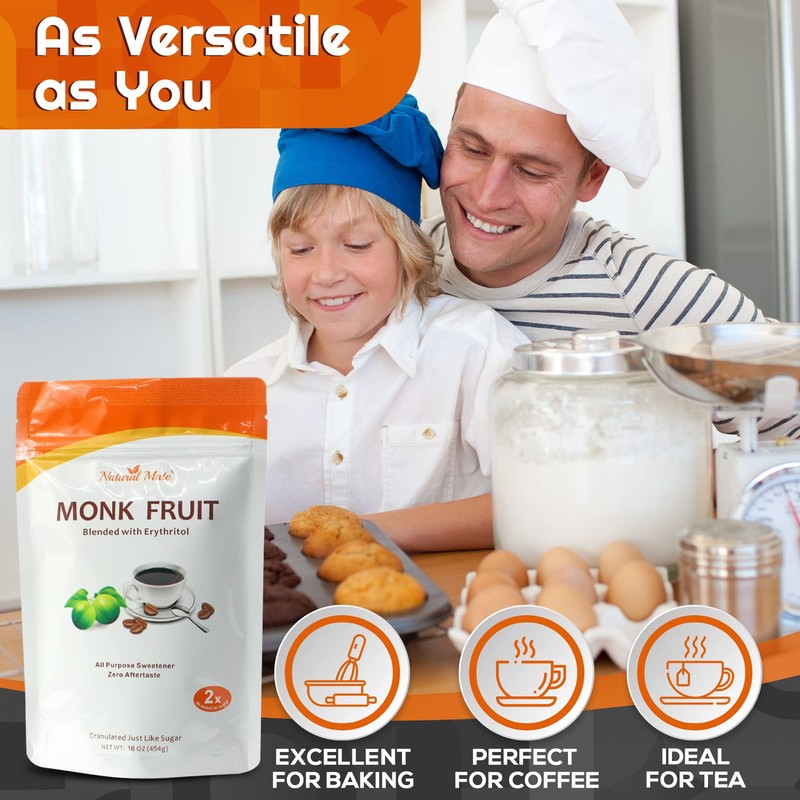 Natural Mate All Purpose Monk Fruit Sweetener is blended from the real fruit extract and Erythritol, which brings you a rich and sweet sugar taste without the calories and bitter aftertaste.